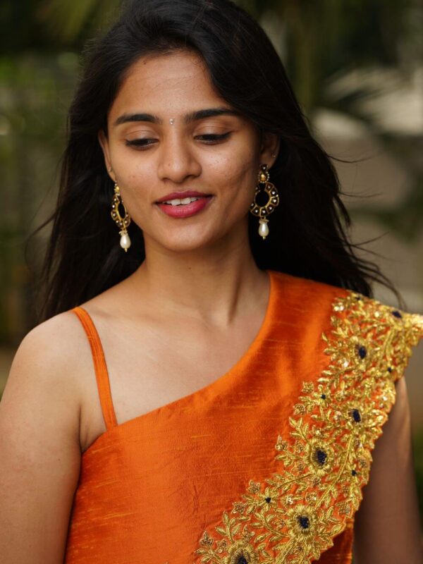 A line skirt paired with a one shoulder embroidered crop top fabric : Raw silk pattern : Digital pattern colour : Black, Orange Care Dry Clean Only.