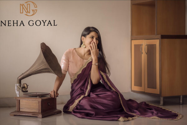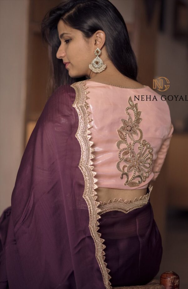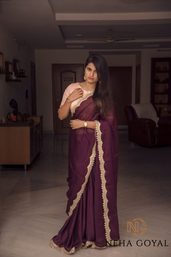 Viscose chinnon saree with a beautiful scallop work paired with a fusion inspired blouse exquisitely hand embroidered
