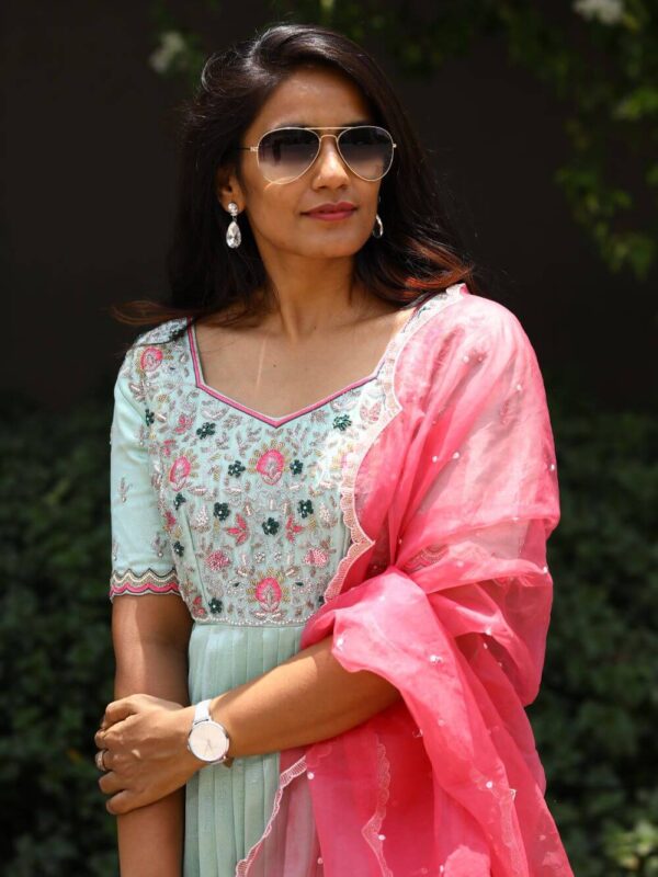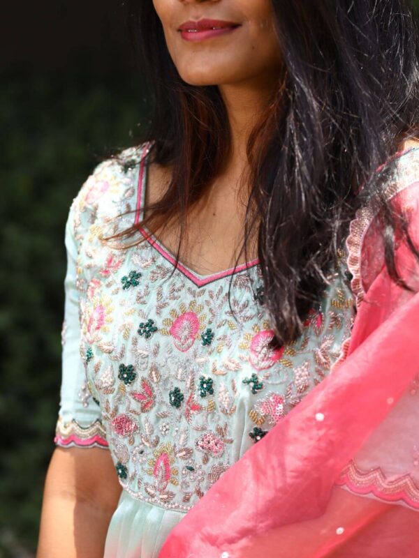 Mint green long dress with a hand emdroidered body and a contrast dupatta