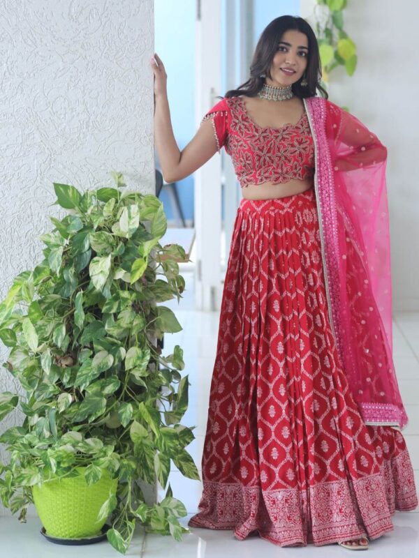 Red self pattern lehenga paired with embroidered blouse fabric : Dola silk pattern : embroidered colour : Red Care Dry Clean Only.