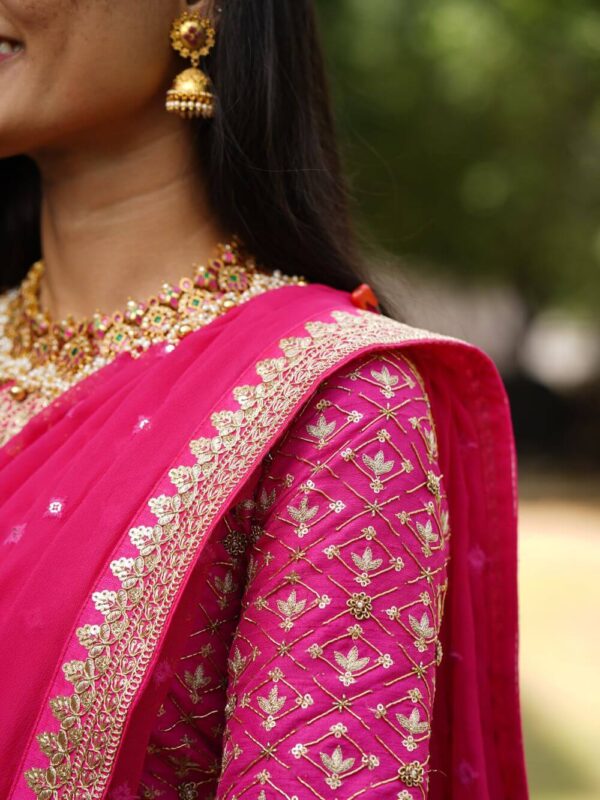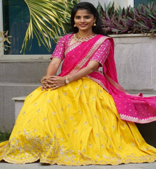 Yellow raw silk lehenga Paired with a embroidered pink blouse